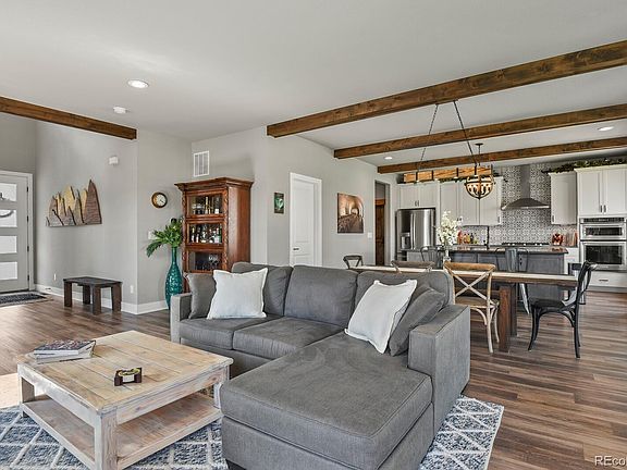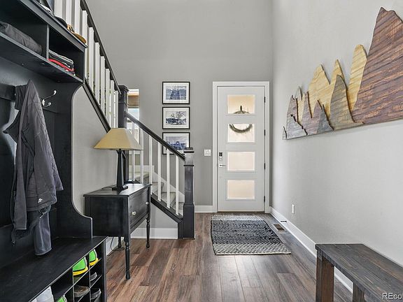 Enjoy Colorado's beautiful sunrise and sunsets from the expanded deck on this highly upgraded Toll Bros. home in Montaine. This home is perfectly located, surrounded with open space. Low maintenance yard with sprinklers and irrigation. Enter the foyer of the home and take in the views! Gorgeous and durable LVP flooring throughout. The eat-in kitchen has quartz counters with porcelain tile backsplash, tuxedo-style cabinets and handcrafted, custom alderwood beamed ceiling. Living room is well-designed with gas fireplace and beautiful views from every window. The upper level has a primary retreat complete with 5-piece bath and walk-in closets. Additional bedrooms have great views and generous, walk-in closet space. Laundry room is conveniently located near all bedrooms. Montaine is a desirable neighborhood located just north of Bell Mountain Ranch. Convenient access to downtown Castle Rock, I-25 is minutes away, too. Community clubhouse is set to open in November. Playground will be ready later this month.