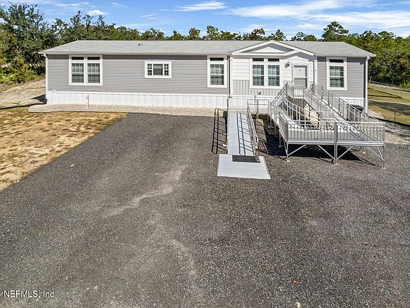 Welcome to this modern, beautifully designed 3-bedroom, 2-bath manufactured home, built in 2021 and set on a spacious 4.5-acre property. This 1,958 sqft double-wide home combines comfort and practicality with thoughtful accessibility features, including a ramp leading to the front door. Inside, you'll find stylish 9-foot trace ceilings and durable vinyl flooring with carpets in the bedrooms. The primary suite boasts a luxurious walk-in shower, while a charming farmhouse sink anchors the kitchen.