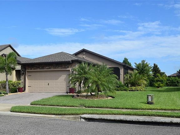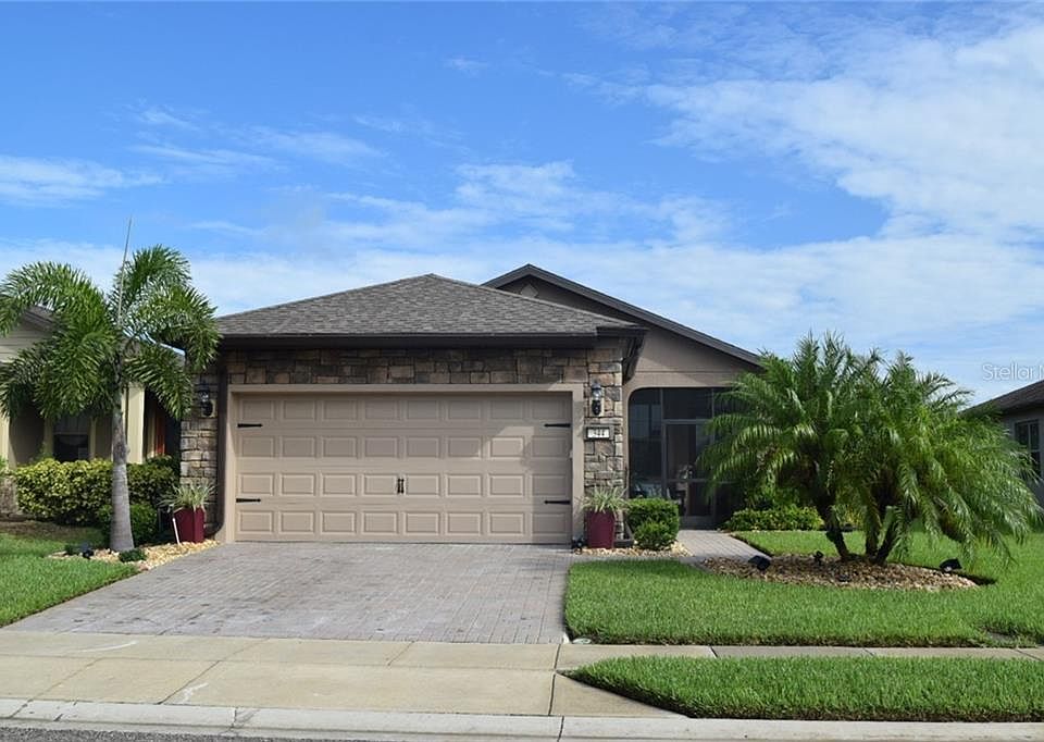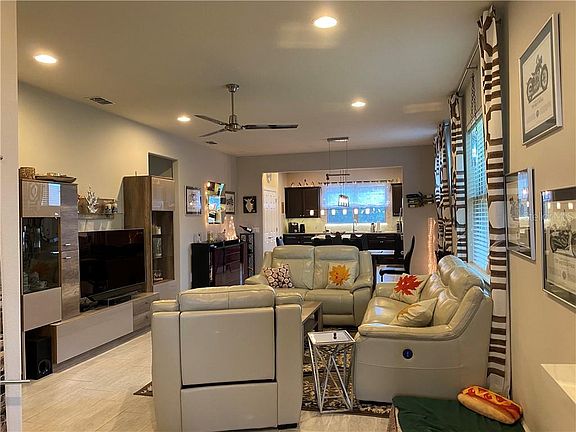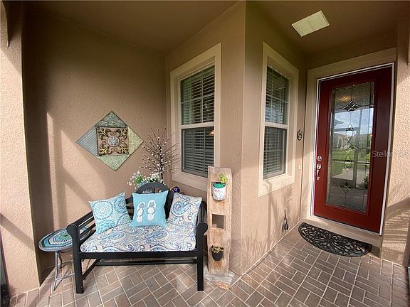 Come see this immaculately maintained SOLAR home with a HEATED POOL in the active 55+ community of Del Webb Orlando! This Taft Street model with 2 bedrooms, 2 baths and a flex room is located on an over-sized lot close to the clubhouse. The spacious gathering room opens to a dining room and kitchen with a large island, separate pantry, granite counter-tops, modern all wood cabinets and stainless steel appliances. The private owner's suite is located at the rear of the home and includes a beautifully appointed bath with double sinks, a large walk-in closet and tiled shower. This home includes a gorgeous 10'x22' heated pool with waterfall, multi-color lighting and pool cleaner. A wall mounted television is included for entertainment while relaxing in your pool. The screened enclosure has built-in lighting for that evening swim! There are so many extras in this home including a power roll-up garage screen door, storm gutters, hurricane shutters, solar panels and concrete curbing with very private and tasteful landscaping around the pool area. A Low solar lease coupled with a $5,000 energy package yields almost non-existent power bills. Rounded drywall corners, 5 1/4" baseboards, solar tubes for extra lighting and an electric wall mounted fireplace add even more value to this lovely home. You will feel right at home at Del Webb Orlando, the premier 55+ community in Central Florida! The community features a gorgeous 30,000 sq ft clubhouse with indoor and outdoor pools, tennis courts, pickle ball courts, bocce ball, basketball, fire pit, miles of walking trails and a dog park for your furry friend. Inside the amenity center, friends gather to enjoy the tavern, computer area, ballroom, activity rooms, walking track, ping pong tables, pool tables and a world class gym. Just a short drive away you will find Walt Disney World, Universal Studios, Seaworld, waterparks, shopping and eateries of all kinds. Del Webb Orlando is located a comfortable drive from both the east and west coast beaches and the Orlando International Airport. Come join us!