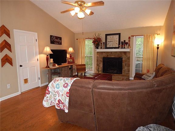 Enjoy the rocking chair front porch in this home. Vaulted family room w/stone fireplace and hardwood floors, den/ library, kitchen w/ painted cabinets and back splash, large master suite and spacious secondary bedrooms. Large, fenced backyard w/detached workshop/boat storage. Extended driveway to detached garage in back yard. This will make a great workshop!