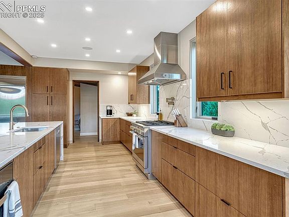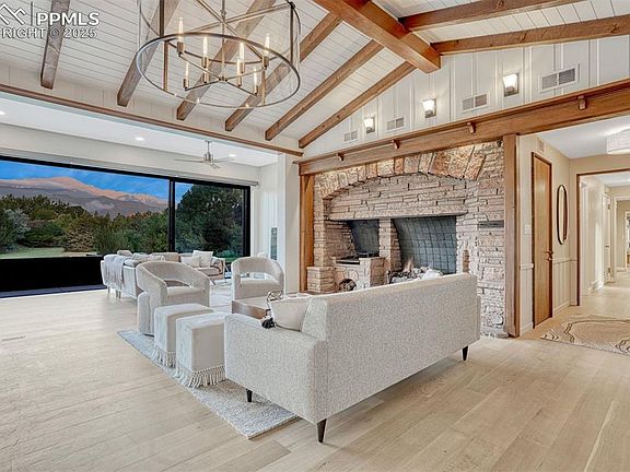 This historic Texas Ranch House/ Western mid-century is warm, inviting, and impeccably maintained, blending original character with modern luxury in Kissing Camels. The million-dollar renovation led by respected Art C. Klein Construction carefully preserved the home’s historic character, including the original sandstone fireplace and sandstone exterior, while adding modern enhancements such as new Hardie Plank board-and-batten siding, fresh exterior paint, upgraded insulation, Class-4 impact-resistant roof, standing-seam metal accents and high-end systems throughout. Set on nearly an acre across two lots, this sprawling ranch offers 100% main-level living with no stairs providing privacy, mature trees, and unobstructed views of Pikes Peak and Kissing Camels. Ideal in scale for entertaining and everyday living, the home’s open-concept spaces include a living room, dining area, and gourmet kitchen with a 28’ x 9’ NanaWall sliding glass wall, quartersawn wide-plank white oak hardwood floors throughout, Quartz countertops, and original architectural details. The home features 4 bedrooms, each with attached baths, a dedicated office, 3 custom Dutch doors, and all-tile baths, catering to retirees, second-home buyers, and golf enthusiasts. Luxury upgrades: renovated electrical, plumbing, HVAC, Trane AC/Furnace, Mitsubishi Hyper Heat mini-split system, AO Smith Pro Line water heaters, and Lutron roller shades. Outdoor living: back patio with corten steel 8’ firepit, newly landscaped grounds with piñons, ponderosas, and bottlebrush pine, and a 9-zone Rachio sprinkler system. Blueprints available for further addition. Community & Location: fully gated with manned 24-hour security, minutes to Garden of the Gods, Kissing Camels golf course, and downtown Colorado Springs (10 minutes). Ideal for luxury entertaining, retreat living, or remote work. Historic charm, modern luxury, sprawling ranch layout, and breathtaking mountain views—truly a once-in-a-lifetime property!