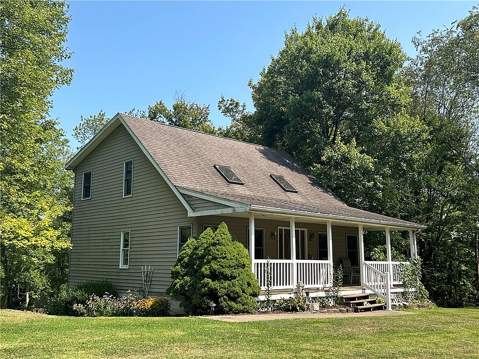 Looking for a modern home in the country? You'll be impressed by the open floor plan, vaulted ceilings, and hardwood floors. A beautiful white on white kitchen with granite countertops provides you with a contemporary look. Be the center of attention as you cook and entertain at the island. Plenty of cabinet space and storage. Stainless steel appliance package includes refrigerator, glass top electric range, microwave, and dishwasher. Plus a large "country style" sink. The living is big, bright, and full of light. Primary bedroom is on the main level. Features double closets, ceiling fan, and private covered porch. Primary bathroom provides a walk-in shower, built-in vanity counter, AND laundry area including washer & dryer. Upstairs offers 2 bedrooms, a full bathroom, a linen closet and a mezzanine view of the living room. A fully finished walkout basement offers more living space & storage. Plus: wooded 4 acre lot, two car detached garage, two sheds, a Quonset work shop / garage