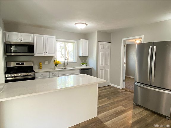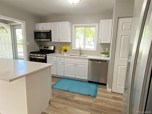Best value remodeled house in University Hills. This open floorplan home has 5 legal beds, or use it as 4 bedroom plus private home office. The two baths are brand new and sparkle with high end finishes and tile. The open kitchen is a gourmet dream with all new cabinets and features large breakfast bar, white and grey slab granite, new SS appliances and included stackable laundry. The living area is oversized and features a beautiful fireplace that doubles as a HEATER. Swamp cooler keeps things comfortable. The five bedrooms allow you to create a work from home office with private bath. Master bedroom is large and has a door to the oversized 7040sf fully fenced backyard. There are raised beds for your own garden plus two storage sheds to hold the extras. Not only are you a two minute walk to Starbucks, you are just minutes from light rail, I-25, downtown Denver and DTC. The roof is newer and has a 5 year roof certification. The furnace is brand new. Come check it out-showings start Saturday.