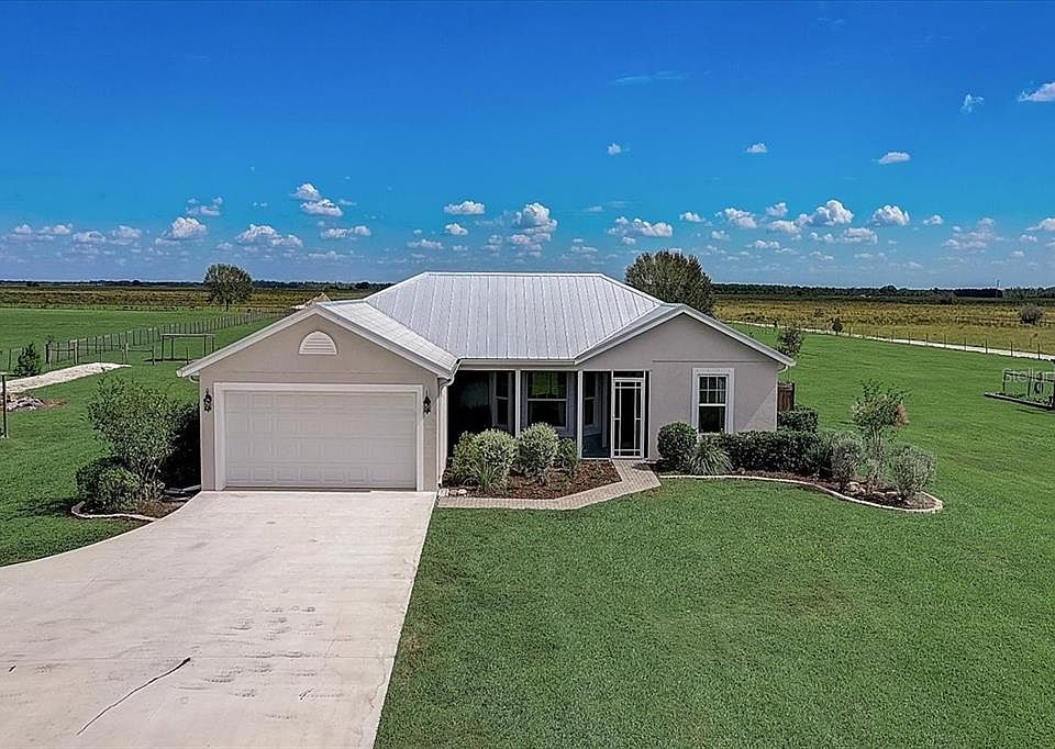 If you've been searching for peace and quiet, this is the property for you! A gorgeous concrete block 3 bedroom, 2 bathroom home that sits on 5 acres with a beautiful pond. As you enter through the front door, you'll notice the open/split floor plan with vaulted ceilings in the main living area and gorgeous kitchen with a walk in pantry and solid wood cabinets. Built in 2017, this newly constructed modern farmhouse home is decked out with a 2-car garage, metal roof, double pained low energy windows with hurricane shutters, 15 seer AC system, SS appliances, solid wood cabinetry and more. Professionally landscaped with fencing around the property. With no deed restrictions or HOA, you can utilize this property to the fullest. Bring your toys, horses, cattle and more to make this home your own and start enjoying the quiet, country life today!