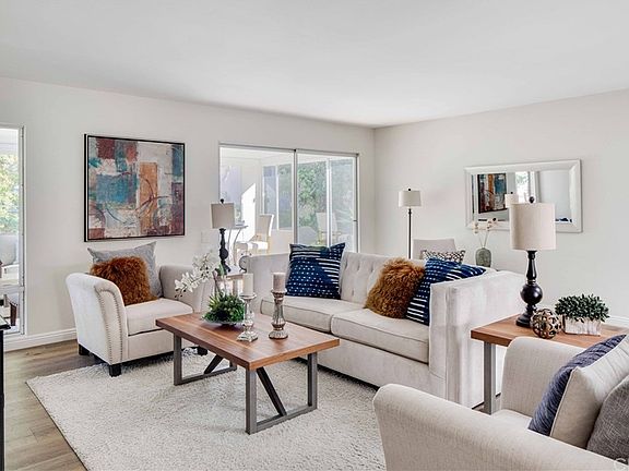 55+ community! 3BD/2BA remodeled "Andaluz" with only one attached wall, oversized 2 car garage and located in a quiet area on the west end of Laguna Woods near Laguna Canyon Wilderness Preserve and Clubhouse 6. You'll love this inviting home with its beautifully landscaped front courtyard areas ready for relaxing while enjoying a cup of coffee or glass of wine! The interior features wide plank luxury vinyl waterproof flooring and smooth ceilings throughout. Bright kitchen with large window looks out to the courtyard and is updated with granite countertops, new stainless appliances, recessed lighting, updated cabinets with soft closings, lazy susan, and display areas. Your eye is next drawn to the large architectural skylight in the dining area and spacious living room that leads out to the multi-purpose enclosed back patio adding an extra 220 sq ft of living space that is not even included in the total square footage listed. This is a great entertaining home with lots of space to spread out both indoors and out to enjoy with friends and family! Backyard area is set up on a bluff with some perfectly placed trees so there is a nice feeling of space and privacy. The master suite has direct access out to the open, yet nicely covered, part of the rear patio. Both bathrooms have been updated with new faucets, fixtures and renovated vanities. 2 guest bedrooms look out to the trellis-covered front courtyard and one has sliding glass door leading outside. Enjoy!!
