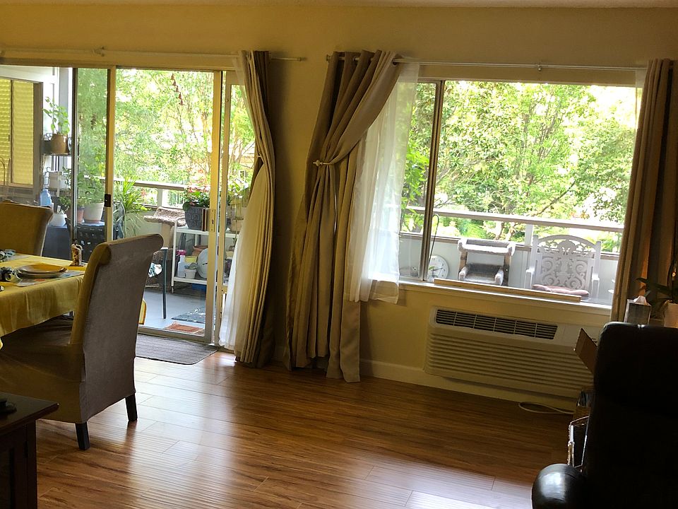 Lovely Claremont model end unit. 2 bedrooms, 2 baths with fabulous bamboo like laminate flooring in entry, living, dining and kitchen. Extra large deck with side enclosure that welcomes a tree studded setting. Inside laundry. Carport and locked storage close to manor. Hurry- Rare 2 bedroom AND 2 baths! Do not lock screen door.