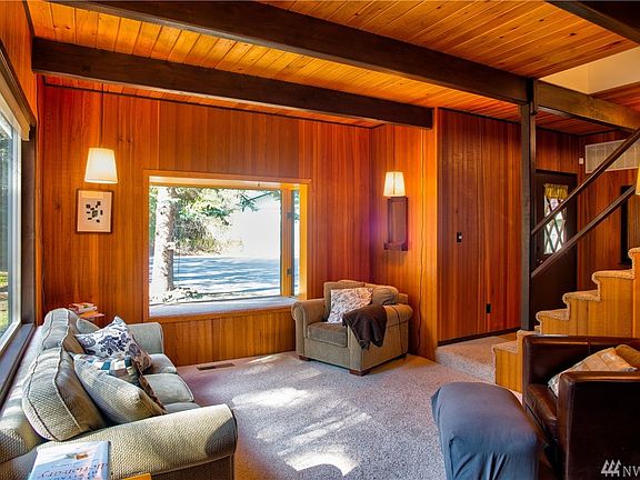 Perfect balance of seclusion and light. A private paved driveway takes you through the trees to a very open site. Nicely updated 1 1/2 story home featuring a warm living room with fireplace, a country kitchen with wood burning stove, dining room, family room, 2 bedrooms, a 3/4 bath and two spacious decks. Upstairs is a spacious rec room and a master suite, with full bath. Just steps from the house is a 2 car garage & carport, separate RV storage with office space, and a cord-wood cottage.