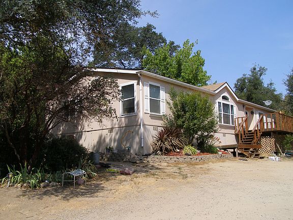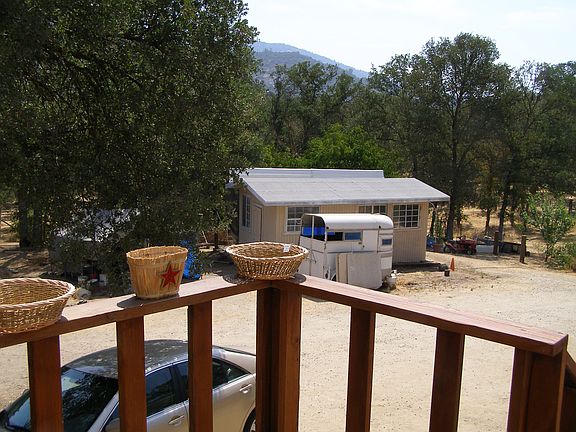 5+ Acres on oak studded rolling hills that is 100% usable. The Main Home was built and installed in 2004 and is 1,664 Sq ft with 3 Bedrooms, 2 Baths, walk in closets and sits on a permanent Earthquake Rated Foundation. It has DSL internet that is hard wired to the home. Right across from the lovely porch is 12 x 20 shop / Barn with an additional 12' of covered cement, great for hay, toys or any equipment. It also comes with a wonderful view of the mountains, tons of fruit trees including, nectarines, grapes, almonds, peaches, apples, oranges, vegetable and herb gardens. Most are on drip lines for easy watering, a 12-15 gpm well with a 2,500 gal storage tank and a fenced area for the horses, dog kennel and more. The 2nd unit was built in 1968 and comes with its own driveway, address, utilities and entrance that is not viewable from the main home.