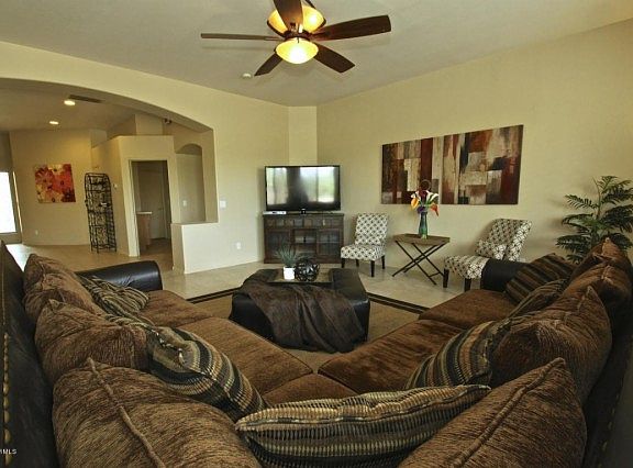 Better than new! This spacious 4 bedroom home shines bright with fresh paint, new upgraded carpet (bedrooms are the only carpet) and custom tile in the great room. Very popular single story, split BR floor plan with flexible use rooms for today's lifestyle. Island Kitchen features extensive counter & cabinet space, full pantry, custom tile counter top on island & top of the line stainless LG appliances! Kitchen opens to Great room, great entertaining space. Owner's suite has room for seating and sleeping areas. Master bath features soaking tub, separate shower & dual vanity plus a huge walk in closet. The professionally landscaped backyard faces a greenbelt area with splendid sunset views. Move in ready, there is nothing the buyer of this home will need to do. Pride of ownership home!