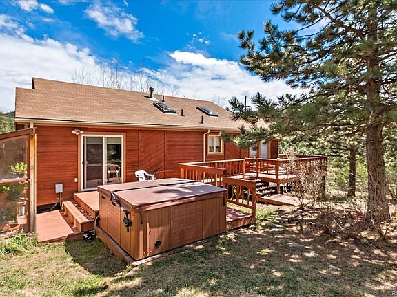 Sunny year-round, updated and well maintained home on private, landscaped parcel with easy Hwy 285 access. Vaulted ceilings and open floor plan. Fantastic outdoor living with wrap-around deck, mountain view, 8 person hot tub just a few steps from master bedroom, and cozy year-round green house. Over an acre of level and gently sloping grass with mature Aspen and plantings. Walk to dining, market, post office, Park & Ride, and amenities of Pine Jct. Over-sized garage with workspace and storage. Wine rack included. Fenced yard, covered dog run with pad. New hot water heater, newer well pump.