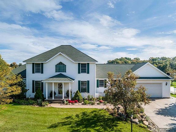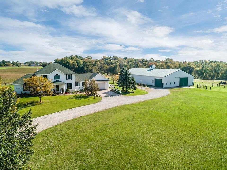 Welcome to this impressive custom-built 2-story home on 70+/- acres offering 4 bedrooms, 2.5 baths, and a thoughtfully designed layout. The main living area boasts 18-foot ceilings, a striking fireplace, and rich hardwood flooring, giving the space a warm and inviting feel. The gourmet kitchen features beautiful granite countertops, shaker cabinets, and plenty of room to entertain.The first-floor primary suite is a retreat in itself, complete with a luxurious bathroom featuring a tile shower and Jacuzzi tub. Upstairs, you'll find three additional spacious bedrooms and a full bath. This property includes a full basement, perfect for storage or future expansion, and sits on a sprawling 70-acre lot. A tillable field provides farm income, while the pasture is perfect for horses or livestock. The 64x126 horse barn is a dream, with 15-foot ceilings, offering plenty of space for equipment or animals. Additionally, a 32x30 workshop provides room for hobbies or business needs. Whether you're looking for peaceful country living, space for farming, or a property that combines both, this home is truly a must-see!