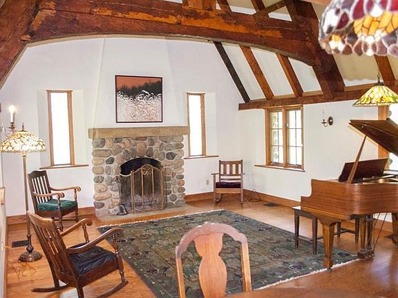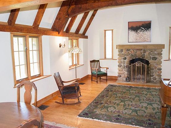 Perhaps the shortest trip you will ever make to the green hills of Wales to bask in the charm of this Cotswold Cottage nestled on 15 rolling acres of meadow & woods just 15 minutes from Ann Arbor. From its stout double wall block construction with 4 inches of rigid foam core & cobblestone exterior to the massive red oak Timber Frame great room you can count on Old World Elizabethan quality with new tech energy efficiency. Walk-out setting with cedar deck overlooking the spring-fed pond & stream beyond. When you enter the foyer/great room you will be dazzled by the cathedral ceilings & oak timbers, hardwood floors & Rumford cobblestone fireplace. Updated cherry kitchen with Bosch appliances & secluded views of nature beyond. First floor master suite, plus a newer addition with cathedral ceilings that works well as a family room or studio. 2nd floor loft overlooks the great rm with 2 BRs up & full bath! Whole house propane generator makes you self-reliant. Watch the video tour!