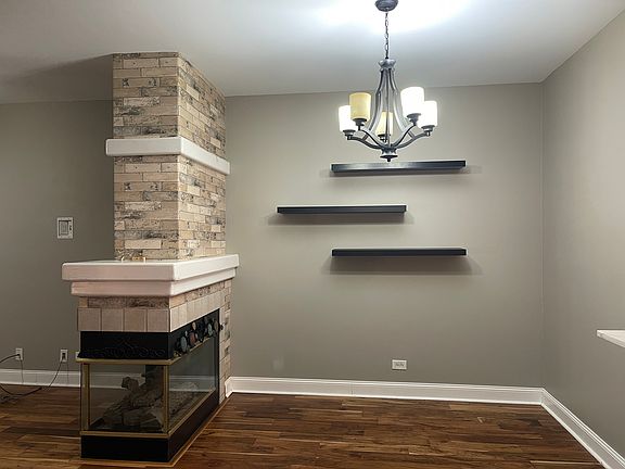 Step inside to discover a remodeled kitchen featuring rich espresso cabinetry with crown molding and under-cabinet LED accent lighting, quartz countertops, subway tile backsplash, stainless steel appliances, updated lighting, a large center island, and a convenient breakfast bar perfect for entertaining or casual meals. The open-concept living and dining areas are adorned with engineered hardwood flooring and anchored by a striking multi-sided fireplace, creating a warm and inviting ambiance.