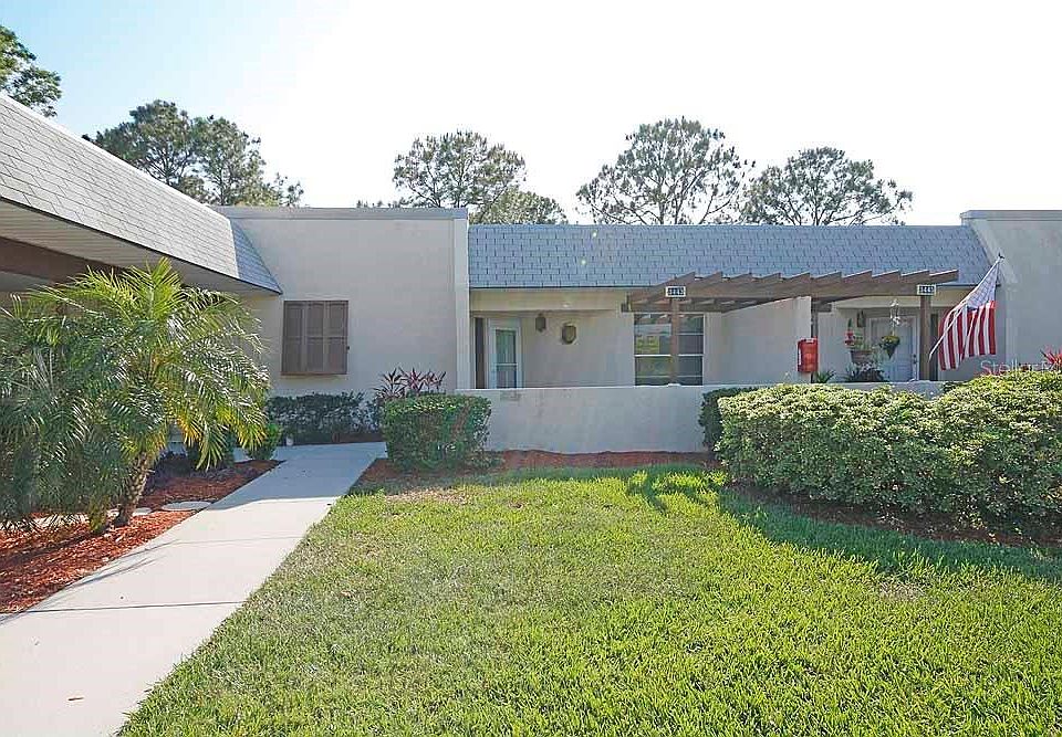 Enjoy the Fantastic golf course and pond view. This is one of the largest units in Seven Springs Golf and Country Club. Fully furnished, just bring your personal items and move right in. Large eat-in kitchen and separate dining room. Sunken living room and step up sitting area. The sitting area has a queen size sleeper sofa with privacy blinds for extra visitors. Two master suites each with a walk in closet. Inside washer and dryer. Private carport and outside storage. Enjoy your private patio with golf course views. Ceramic tile in entry and bathrooms, parquet floors in the kitchen, dining and hallway, carpets in living room and bedrooms. Walk to the clubhouse and enjoy the active community with two golf courses, tennis courts, two swimming pools, restaurant and lounge. 24/7 guard gated entrance adds to your relaxing lifestyle. Convenient to all shopping, Tampa, airports, Clearwater and beaches.