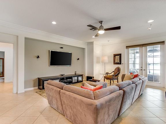 Rare 1-story pool & spa home w/ expansive lake view! 3 bedrooms + separate office/flex room/man cave fully glassed from floor to ceiling w/ state-of-the-art air filtration system. Open concept floor plan welcomes you! Kitchen w/ birch cabinets, granite countertops and large raised bar! Master suite is a true retreat w/ his & hers custom closets, office space & vanity area. French Doors lead to the travertine patio & heated infinity-edge pool and spa - all operated from your smart phone! NEW 'frameless' screen enclosure perfect for evenings al fresco watching the sun set. Summer kitchen w/ built-in grill, sink, wine refrig & bar. Extended covered patio provides ample shade! Outside fenced-in dog run & doggie door. 3 car-garage professionally finished. HURRICANE IMPACT WINDOWS!
