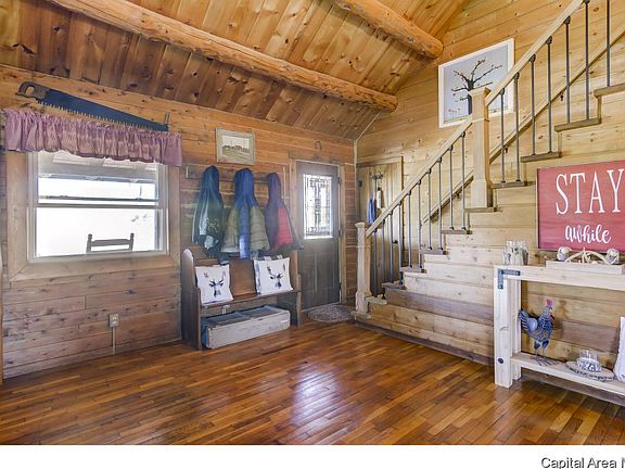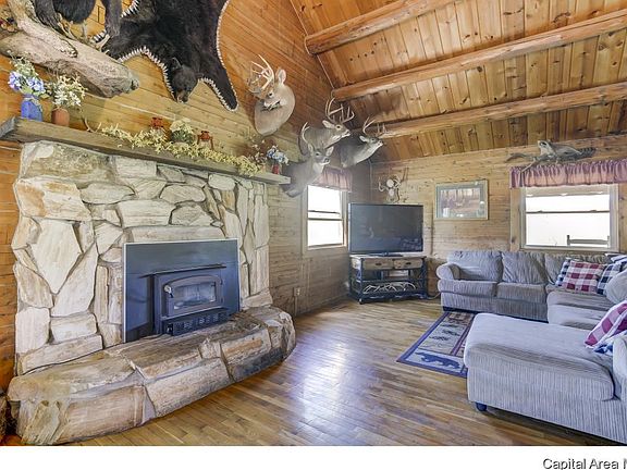 Peaceful, country 4 bedroom log home on over 6 acres in rural Sherman. Many updates including new kitchen, new roof, new windows, new doors, and new deck in 2012. New furnace and AC 2018. Kitchen features stainless appliances and tile floors. Two story living room is open to kitchen and dining with a stone fireplace/woodburning stove. Hardwood floors run through living areas and all bedrooms. Finished basement with family room, second fireplace, and walkout. Awesome front porch and covered deck! 2.5 car garage is insulated. Creek runs through yard and with mature and young trees. PreInspected!