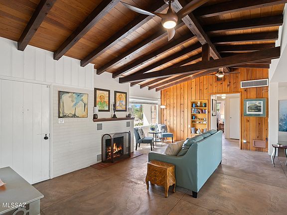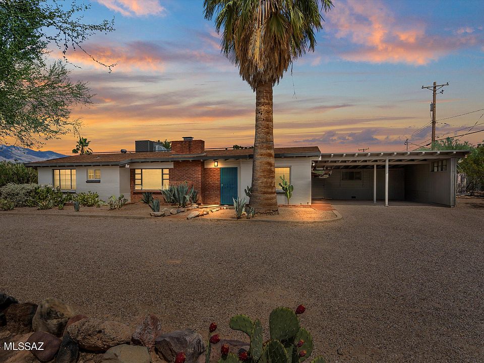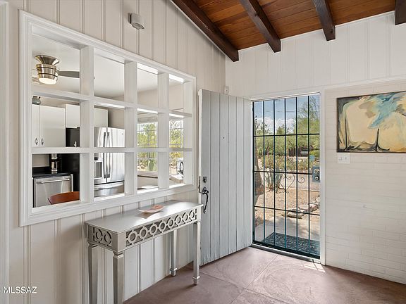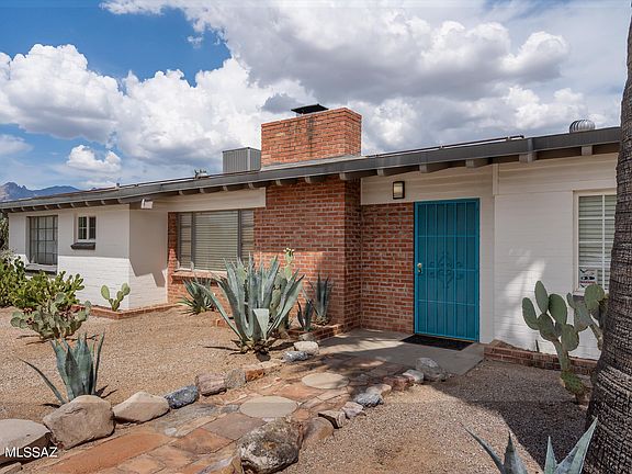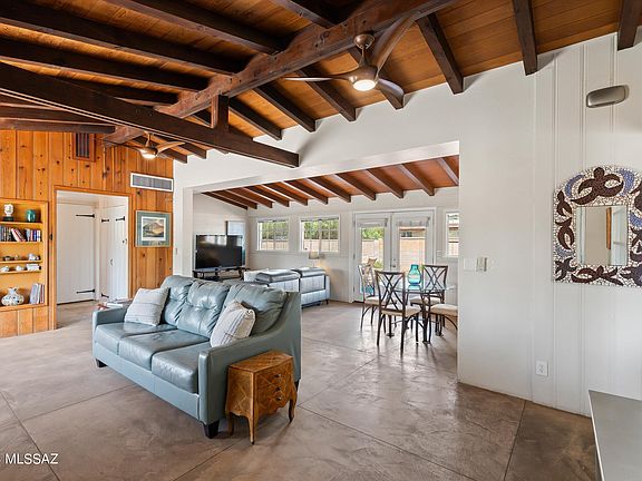 Welcome to this turn-key 2-bedroom, 2-bathroom bungalow ranch, nestled on a generous lot that perfectly blends comfort and convenience. As you step inside, you're greeted by an open floorplan great room, connecting the living room, dining area, and TV space. The eat-in kitchen is perfectly appointed & fully equipped with stainless steel appliances. Outdoors, a covered patio invites you to relax, complete with a built-in brick grill and planter beds. The expansive yard, fully gated and dotted with fruit trees, offers ample space for a pool or an ADU (aka casita).This quintessential Tucson home exudes mid-century charm, featuring ceiling fans throughout, abundant natural lighting, quality blinds, a wood-beamed ceiling, and a tongue-and-groove built-in wood closets. Classic details like the pink bathroom tiles and typical built-ins reflect the era's style. Enjoy serene moments on the back patio with stunning views of the Catalina Mountains. The home also boasts concrete tile floors, a 2-car carport with the potential to convert into a garage, and extensive outdoor storage, including a "tuff" shed, landscaping shed, and workshop. Previously an Airbnb, all furnishings are available, making this home move-in ready and the ideal Tucson retreat.