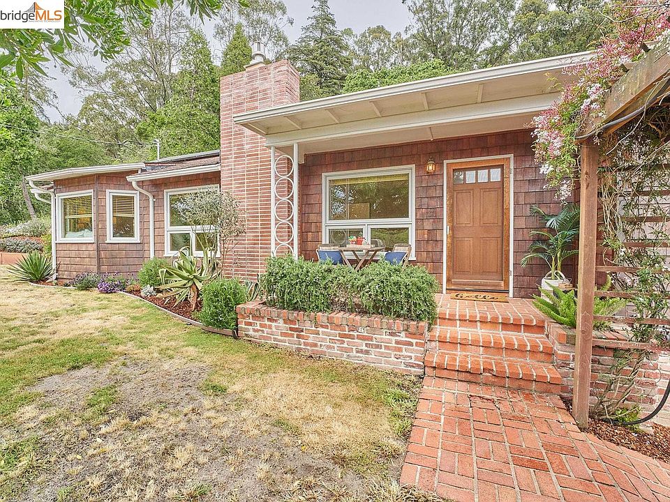 3 bedroom 2 bath all on one level cedar shingle home nestled in the Oakland Hills, will give you all of the feels. Walk up the red brick steps, you are welcomed by a front yard with landscaping that immediately brings a sense of peace. As you walk into this brown shingled home, you see a living room with large windows and tranquil canyon views that bring natural light into the space. A grand stone gas fireplace becomes the focal point in the room. The kitchen, equipped with red Spanish tile detailing, has beautiful light wood cabinets, stone countertops, a gas stove, and plenty of storage. When you walk around the house, you'll find a multipurpose room, spacious main room with bay windows, signature built-in California Closets, newly updated bathroom, and refinished oak hardwood floors throughout. From the kitchen, there are double doors to your secluded backyard that extends up the lush green hillside. An expansive patio makes this outdoor space perfect for lounging, hanging out with family or entertaining guests. An extended deep garage provides ample room for your car/motorcycle as well as additional storage. Owned solar panels on roof with a Tesla Power-wall, plus Air Conditioning.