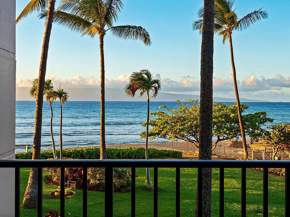 Experience beachfront living at Kaanapali Shores 204, a beautifully upgraded 2-bedroom, 2-bath condominium with stunning ocean and Molokai views from the living room and both bedrooms. Located close to the ocean, you'll enjoy the sounds of the surf and cooling breezes. The preferred north-facing orientation allows you to relax on your lanai throughout the day without direct sun. This hotel-zoned property is ideal for short-term rentals and features central A/C, tile floors, granite countertops, and custom cabinetry.