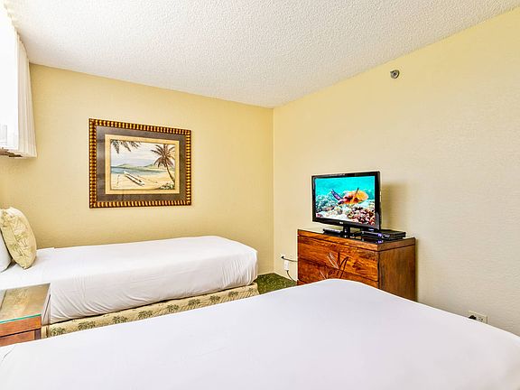 This condo features a large L-shaped couch in the living room which is perfect for the entire family to sit back together and enjoy some entertainment on the flat-screened television. The corner location and window placement in this condo invite natural sunlight to flood in and welcome you to your Maui vacation. This is a 2-bedroom, 2-bath condominium with plenty of room for the entire family. The master bedroom features a king-sized bed with an ensuite bathroom offering a shower with a tub. The master bedroom also has its own view of the tops of the coconut trees right outside your bedroom. The guest bedroom features two twin beds. The guest bathroom also features a tub/shower. The additional sleeping option of a sofa sleeper in the living room allows for a 6-guest maximum occupancy. All Utilities bills are included in the rent.