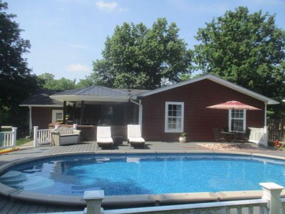 Updated primary bathroomSparkling poolSpacious deckCovered porchPrivate backyard retreat