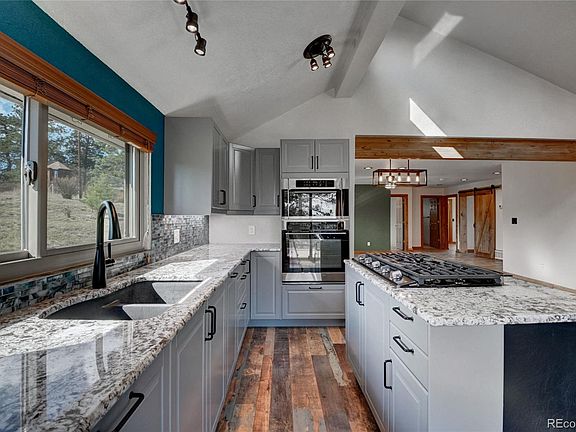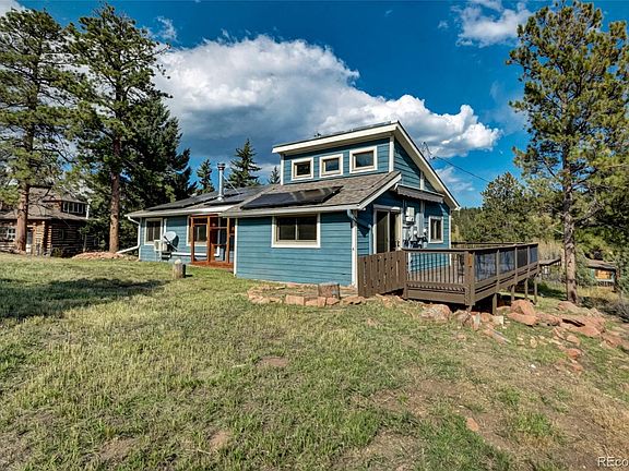 Stunning Mountain Vistas! Situated at the end of the road on .6 acre, which might as well be a million acres as this home backs up to gorgeous uninterrupted scenery. Watch the deer and fox play on your spacious wrap-around deck perfect for entertaining and enjoying the Colorado outdoors. You will fall in love with this remodeled cabin with plenty of charm and a bright, open floor plan. Make meals and memories in the remodeled kitchen, with stainless appliances, ample cabinetry, a gourmet gas stove with retractable vent and granite counters, open to the dining room and living area. Convenient one-level living with 3 bedrooms and 2 baths plus a bonus room that can be used as an office, playroom, or whatever you can imagine. Much of the work has been done: newly remodeled kitchen and bath with heated floor, newer roof and high-efficiency skylights, electrical panel and hot water heater. Fully owned solar energy system so you save big bucks on your electric bill. New flooring throughout. Newer Anderson windows and patio door. Outside areas feature a large, level yard with a rock patio and fireplace perfect for s'mores with friends and family. Walk-in crawl space offers a ton of extra storage. Plenty of parking. Very quick and easy commute - just minutes to 285. Don't miss this opportunity to own your mountain paradise. Schedule a showing today to experience the serenity and beauty of this remarkable home. Septic system suitable for a 4 person (2 bedroom) household.