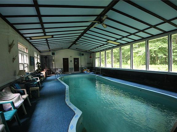Unique Property centered around a beautiful pond. You'll find a main 4 BR, 2.5 Bath Colonial with indoor pool and attached garage, with 2 rental homes or guest homes on a secluded 10.1 acre site. The main home features a large living room, dining room, family room, kitchen and powder room on the main level and 4 bedrooms upstairs. The indoor pool does need some minor repair. The second home is 2 bedrooms and there is an additional cottage. The land is partially wooded, creating a perfect secluded paradise. 85 Additional adjacent acres available for an additional price. Check out MLS#487687