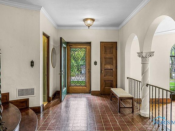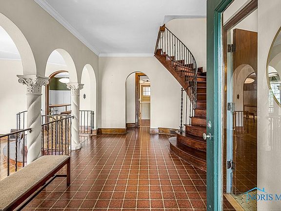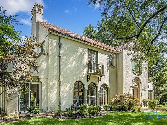 Old World Architecture, Fortress in Ottawa Hills. Arched Palladian windows surrounded by stone, wrought iron leaded doors open to grand foyer with spiral staircase and stained-glass windows. Expansive canopy-ceiling Living Room w/stone FP &French doors to enclosed porch & flagstone patio. Formal dining room w/large bay windows/doors for natural light. Updated eat-in kitchen w/original butler’s pantry. Grand master suite w/FP & balcony. 5 bedrooms, 3 tiled baths. Hardwood floors, stone columns & arches accentuate the grandness. Deep private grounds. Close to Village schools and Univ. of Toledo.