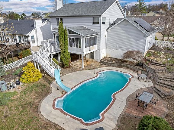 Welcome to this stunning 2-story home with IN-GROUND POOL & Hot Tub! This 3-bed, 4-bath home boasts hardwood floors, dual-zone HVAC system, & solar panels for energy efficiency. The OPEN floorplan features a living room with bay windows, WOODBURNING STOVE/ fireplace, formal dining room, sitting room, breakfast room & 4 SEASON SUNPORCH with power shades. Gourmet kitchen has GRANITE countertops, coffee bar, Stainless appliances, & pantry. Primary suite offers HUGE WALK IN closet, spa-like bath w/double sink vanity, soaking tub & separate shower. Loft provides extra flex space. The partially finished walk-out lower level includes bathroom, huge rec room & storage. Enjoy composite deck & covered patio for entertaining. Situated on a corner lot backing to trees across the street from a park & walking trails, this home offers privacy & tranquility. Highlights include OVERSIZED 2-car garage, central vacuum, & irrigation system. Located in Orchard Farm School District, with easy access to 364.