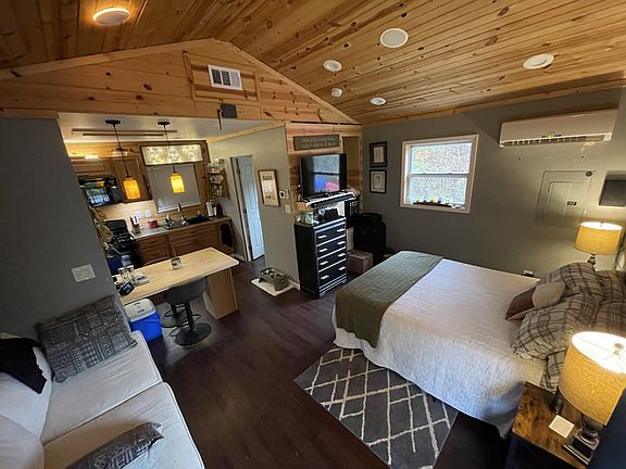 This cabin is the definition of a perfect, peaceful getaway. The cabin has 2 porches, and 10 acres to make it a hunters' dream. The inside features beautiful tongue and groove wood, as well as a newly remodeled bathroom. Cabin comes complete with all appliances, a security system, zero turn mower, and a storage shed. If you are looking for privacy, rest and retreat, this may be just the property for you.
