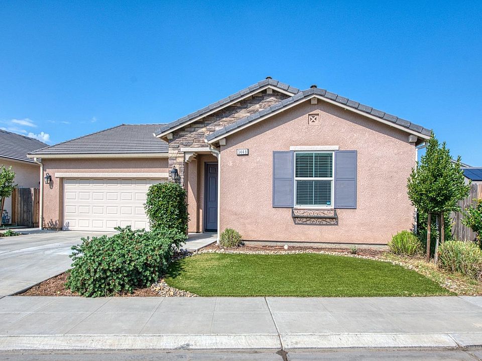 Built in 2017, this residence resides within the Tilia at Temperance community built by Wathen Castanos. The picturesque French country exterior, adorned with stone accent wall, shutters, wrought iron window box and corbels at the arch entry, sets a welcoming tone. Inside, an open arrangement seamlessly connects the kitchen, great room, and dining area, promoting a sense of spaciousness. This fluid living space gracefully extends to the low maintenance-sized outdoor area, perfect for both dining and relaxation. The kitchen boasts granite countertops, accompanied by an island housing a stainless steel sink with a pullout faucet. This culinary space also includes a freestanding gas range, a microwave vent hood, and a captivating basket weave patterned full tile backsplash that draws inspiration from thoughtful design. Throughout the residence, extended tiling creates a cohesive aesthetic, while the bathroom and laundry areas are thoughtfully positioned off the hallway for convenience. The secondary bedrooms, situated at the front of the home, feature carpeting, while the bathrooms showcase granite countertops and chrome fixtures, complemented by shower/tub enclosure at the secondary bath. The owner's suite is accompanied by a walk-in closet and twin sink vanities, adding to the design of this home. The exterior has a leasedseven panel solar pkg, elevated garden beds, an extended patio, and a concrete side walkway leading to garage. Please note photos are virtually staged.