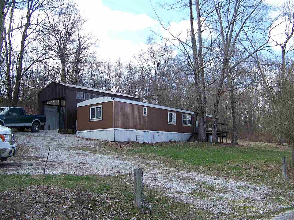 Hunters Dream and Week-end Paradise. Older 14 X 56 mobile that has had some TLC recently with some new flooring, redone bath with a corn heating stove in living area. Almost new 16 X 32 Garage and a nice shed for storage. All on 1 acre with county blacktop frontage and not far from Patoka Lake.
