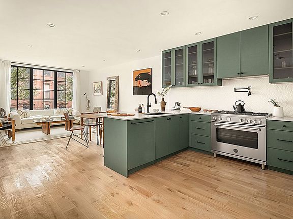 Upon entering the home, through private key locked elevator, you are welcomed into the striking gallery entrance that will surely captivate any art lover. From there, the unit dramatically opens to the sweeping great room featuring a spacious living room, dining area, and chef's kitchen. Every unit at 345 Bergen Street was thoughtfully designed for seamless entertaining. The living room effortlessly flows into the chic and functional chef's kitchen - complete with an eat-in peninsula, 5-burner Bertazzoni gas stove, and coordinating premium appliance package. It's a space where style meets practicality - perfect for hosting and everyday living alike.