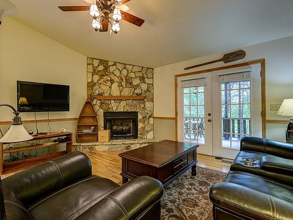 An incredible home in the mountains! This one level FULLY FURNISHED home also has a full finished basement sitting perfectly on a wooded lot with detached garage and a single carport! Open concept Great Room with hardwood floors and a stone fireplace to warm the chilly mountain evenings. French door access to your screen porch to sit and enjoy the quiet of nature. Your kitchen has white appliances with an island is convenient to your dining area. Down the hall are your laundry, guest bed/bath plus your Master Ensuite. Downstairs is the Rec Room with access to your lower patio, 3rd bathroom and TWO bonus rooms! Fiber Optic internet coming soon. This is one sweet home just waiting for YOU!