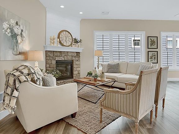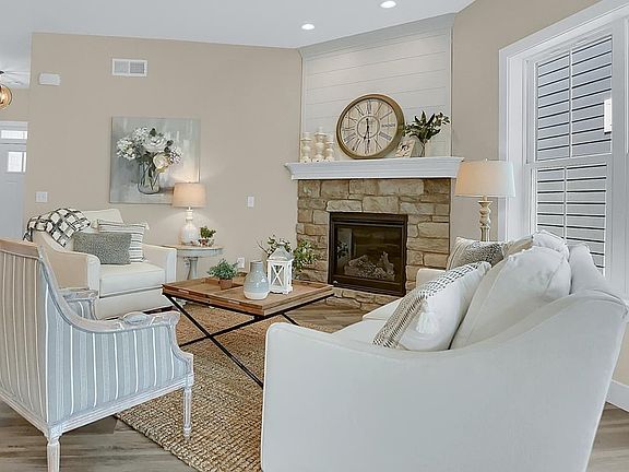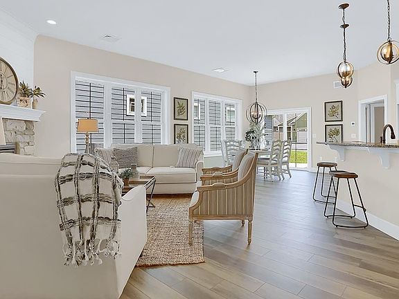 This comfortable one-story, 1,800+ sq foot home features a front porch, rear 2-car garage with mudroom entry, side patio or optional outdoor living area, 2 bedrooms, a study with optional coffered ceiling, and 2 baths.. Optional gas fireplace in the living room, plenty of natural light in the dining room, and a convenient owner's suite with a large closet, and a private bathroom. Open kitchen with raised breakfast bar counter provides easy access to dining room and living room. (Pricing may reflect limited-time savings/incentives. See Community Sales Manager for details.)