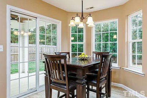 Wonderful location, a spectacular MOVE-IN-READY. Beautiful updated luxury vinyl entry to Kitchen. Spacious living rm. Formal dining rm/office w/GoogleFiber availible. Bright & open Breakfast nook, kitchen w/plenty of cabinets. Master suite includes vaulted ceiling, garden tub/shower w/large WIC. Upstairs bonus/bedroom you choose. Enjoy your private fenced backyard sitting out on the covered porch & deck.Neighborhood pool & playground. Close to RTP, RDU, I40 & I540, shopping & restaurants One year lease. One month deposit. Renter is responsible for water, electric and gas. No pets. No Smoking. Follow all HOA parking and other rules.