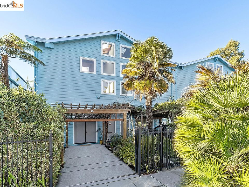Amazing, sun-drenched three-story townhouse. Vaulted ceilings, Douglas fir tongue and groove wood detailing surrounds massive windows on all sides and multiple skylights. First floor has a kitchenette, separate laundry room, bedroom, full bathroom and large living area with custom built-in cabinets and plenty of storage. Access to the backyard is located directly off the first floor. Second level has cozy wood floors throughout and an open floorplan with a second very spacious living room, huge bookshelf and an amazing chef’s kitchen with plenty of counter space and high-end appliances. Windows from kitchen look out onto the yard. Off the kitchen - French doors flow onto an amazing deck creating the perfect indoor-outdoor connection. On the third floor is the second large bedroom with built-in shelving and a lovely ensuite bath. This bathroom has a massive opaque skylight that feels like you are showering on top of the world. Backyard is spacious and super private with mature plantings, trees, café lights and a garden shed. The front of the home is gated with off street parking a wisteria trellis and an EV charger. Lewis St is a great west Oakland location – surrounded by industrial chic buildings, townhouses, condos, art lofts and historical homes. Dog park and BART close by.