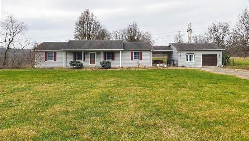 Welcome to Mustard Lane where you will find peaceful rolling hill views along with plenty of acreage to roam on! This level entry three bedroom ranch home has plenty to offer and appreciate! Large detached garage offers great possibilities for two cars and/or additional storage space! The covered rear patio overlooks the expansive yard. Upon entering you'll find an open kitchen and living area with center island. Main floor laundry room! Three spacious bedrooms including a master with private bath and raised tub. Bring your imagination and willingness for some cleaning and cosmetic updates and turn this one into your dream home!
