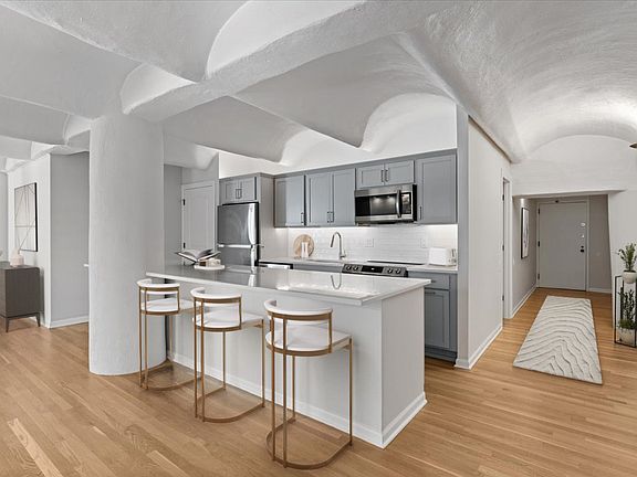 Private south-facing balconyOpen floor planTons of storageBarrel-vaulted ceilingsBrand-new hardwood floorsStainless steel appliancesSe corner unit