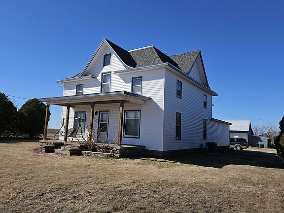 Welcome to rural country living in Barton County, close to town with blacktop roads all the way. This 7~bedroom, 1 bath home sits on property that is 6.9 acres with 5 outbuildings and a wonderful view of God`s nature and beautiful sunrises and sunsets. This large 2 story home has newly installed warrantied polymer siding with thick insulation backing installed in 2023 by Continental Siding costing $70k. At the same time, there was blown~in insulation into the exterior walls and attic and added a new high efficiency heating and air with heat pump. The heat pump blows in heated air from outside and save on propane usage. Laundry, kitchen, dining room, bathroom and tub and shower, master bedroom and an additional bedroom\office located on main floor. Upstairs are 5 bedrooms, a walkout balcony over the front porch on the east side of the house with full view of the morning sunrises, and a full~size stairway leading to a large, insulated attic that can be used for storage or as another bedroom or play area. All bedrooms are very large with large closets. The unfinished basement is a great area for tornado shelter and has two exits and additional room for storage. Simplisafe security system stays. Propane, gas, septic system and water well. Located three miles North of Pawnee Rock on 110 Ave blacktop (just North of the Mennonite Cemetery)..