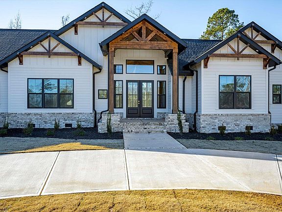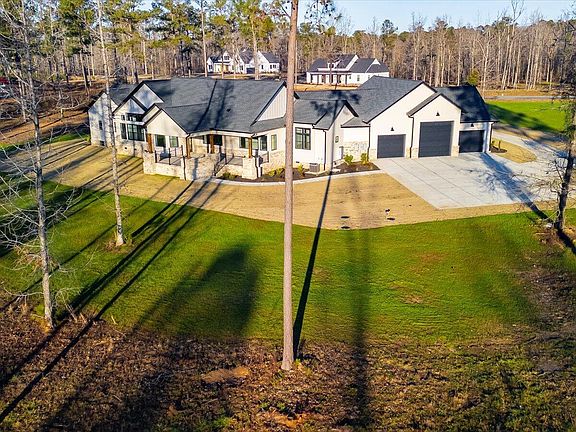 2025 SMC WINNER OF BEST CUSTOM HOME OVER 1M (RUNNER UP) AND BEST CUSTOM KITCHEN OVER 1M! ABSOLUTLEY STUNNING CUSTOM BUILT HOME ON ALMOST 5.5 ACRES! Every attention to detail was given to this home and it features more upgrades than words can convey! Grand double doors leading into the foyer, which features herringbone pattern hardwood floors, seating bench with shoe storage and views of the open floor plan beyond. Great room with cathedral ceiling, faux wood beams and brick double-sided and see through fireplace. Formal dining room with serving bar featuring quartz counters and floating shelves. Hardwood floors throughout main living areas and bedrooms. Tile in all baths. Stained tongue and groove ceilings in kitchen, dining and owner bedroom. True chef's dream kitchen with custom soft close cabinets, 7 foot island with vegetable sink, quartz counters, brick backsplash, pot-filler, dimmable toe kick and under cabinet lighting, professional Z-line black appliances with gold accents including LP gas range with double ovens. Spacious walk-in pantry with custom cabinets and shelving. Breakfast area and hearth room off kitchen with brick fireplace. Laundry room features mud bench, cabinet storage and quartz countertop work area with utility sink. Owner bedroom with picturesque views of the backyard and has a luxury bath with double vanities, quartz counters, black framed mirrors, free standing tub and tile shower with rain head and body sprays -- all with a curbless feature making it one wet area. Three guest bedrooms on opposite side of the home feature walk-in closets with pocket doors, two sharing a jack and jill bath and one with its own private bath. 8 foot doors throughout. Architectural shingles with thermal barrier roof system for energy efficiency. Approx. 400 HSF flex room off garage would make a great office, gym or craft area. 5-car tandem garage with two 10x9 doors and one 12x13 door in the middle, large enough for a boat or RV. Rear covered porch features black aluminum railings, tongue and groove ceilings, brick grill area with RecTeq E-1300 series built-in & cable/electric outlet available. Over 2 acres of the lot is landscaped with over 100 plants in mulched beds and a 14-zone irrigation system.