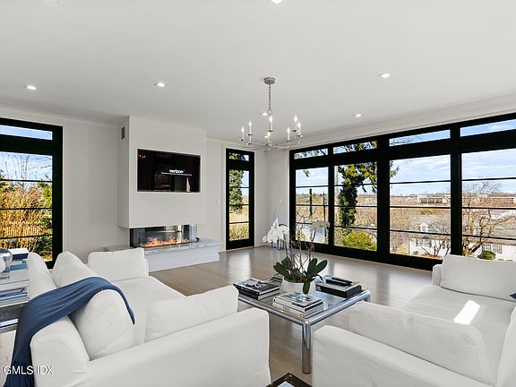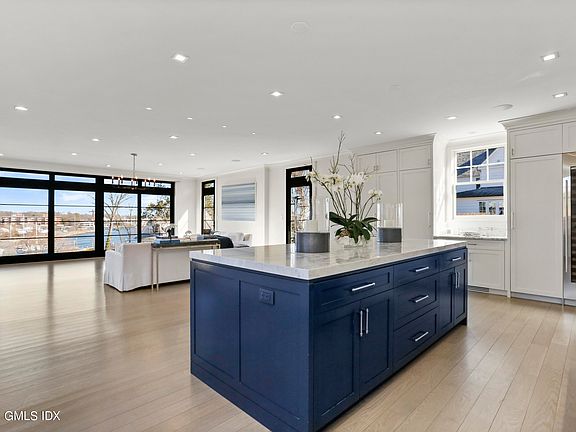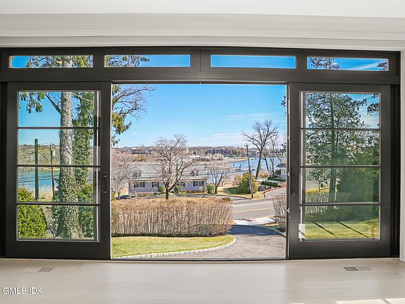 Stylishly renovated and reimagined five-bedroom Colonial showcases stunning views of Greenwich Harbor nestled off a private driveway on the Belle Haven Peninsula. Chic 2020 updated interior boasts sundrenched quartzite kitchen with custom cabinetry open to family room with linear gas fireplace, white oak floors and uninterrupted water views through new floor to ceiling iron clad windows, living room with wet bar and dining room on main level. Remodeled lower level affords comfortable rec room with bar; half bath and laundry room. Serene master suite with expansive deck overlooking the Harbor; two bedrooms and full bath comprise second level. Top floor provides bedroom, bedroom/office and full bath. With detached two-car garage. Offers an easy sidewalk stroll to town, train and water