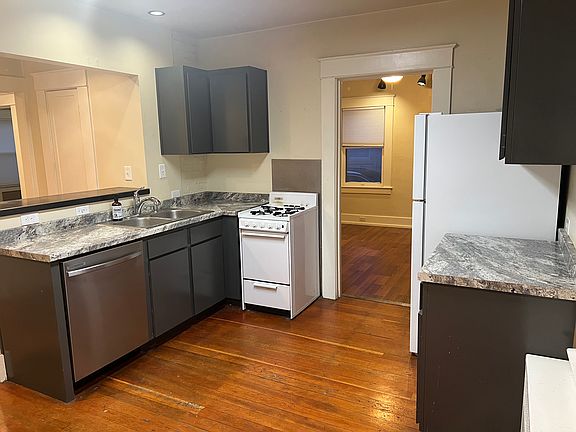 Available 1/1/26! 2BR/1BA home is the perfect blend of modern convenience and classic charm. Spacious living room features fresh paint, abundant natural light, new windows, cordless shades and hardwood floors throughout. The roomy kitchen has granite countertops, a breakfast bar, fridge, stove/range and dishwasher for effortless meal prep. Updated bathroom with newer vanity and glass enclosed shower. Enjoy the convenience of an in-unit washer and dryer. Includes full, additional 800+ sf heated, unfinished basement, perfect for storage, home gym, or creative workspace. The amount of available space can't be overstated!