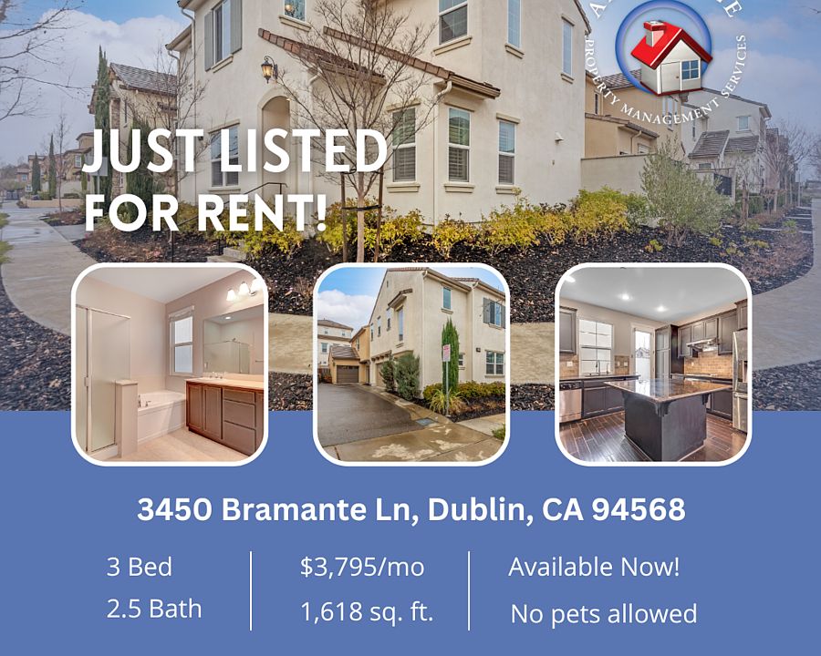 Experience a 3D Virtual Tour by following this link: Schedule a Showing Online Come to see this nice 3 bedroom, 2.5 bathroom, 1,618 sq. ft. home located off of Central Parkway near Fallon Sports Park. The home opens into a large living and dining room with laminate wood floors and high ceilings. Next to the living/dining room is the lovely kitchen featuring stainless steel appliances, granite countertops, a large center island and tons of storage space. The first floor also has a half bathroom. The second floor is fully carpeted and features a full hallway bathroom, private laundry room and the three bedrooms. The master bedroom offers a private bathroom with soaking tub and walk-in shower. The property is complete with an easily maintained, private patio space, and a 2-car garage. The community offers access to a community pool, spa and fitness center. The neighborhood is home to several great schools, multiple parks and the Waterford Shopping Center. Available for move-in ASAP Rent: $3,795.00 /month Security Deposit ranges from $4,745.00 - $7,590.00 unless you qualify for our zero security deposit option provided by Obligo. Applicants that do not meet all the Basic Criteria, but exceed the Minimum Criteria, may be approved with a higher security deposit. If you join Obligo, you will not be required to pay a security deposit! Minimum Lease Term: 12 months Preferred Lease Term: 24 months Pet Policy: Sorry, NO Pets Refrigerator: Included Washer/Dryer: Included Gardening: Tenant Responsibility Parking: 2-Car Garage Utilities: All utilities are the Tenant responsibility Showings are available by appointment only. Schedule a showing online by clicking the Schedule a Showing link. The property is professionally managed by Advantage Property Management Services. Leasing Contact: Harrison Smith (DRE# 01902063) READ THIS IMPORTANT INFORMATION BEFORE YOU SCHEDULE A SHOWING There is a $50/adult non-refundable application fee and ALL adults residing in the property must apply. We will (1) verify your identification; (2) check your credit report, unless you receive a Government Rent Subsidy and request to provide verifiable alternative evidence instead of a credit report no later than when the application is submitted; (3) verify your household income and employment, if applicable; and (4) verify your rental history with previous landlords. Most applications are processed in 2-3 business days from the date we receive a completed application and all supporting documentation. Security Deposits are calculated using a risk-based model. Applicants who meet all the Basic Criteria may be approved at the advertised security deposit amount. Applicants who do not meet the Basic Criteria but exceed the Minimum Criteria may be approved with a higher security deposit, not to exceed the legal maximum. We offer a security deposit-free option for qualified tenants using Obligo billing authorization technology. Security Deposits for active-duty military and properties subject to AB12 cannot exceed 1x the rent. Prior to move-in, proof of a current renters insurance policy with APMS listed as an Additional Interest and coverage of at least $300,000 for personal liability must be provided. Please DO NOT APPLY if your credit score is below 650, your household income is less than 2.7x the asking rent, you have ever been evicted, you have negative rental history, or your pets do not comply with this propertyAx83?Ax82A??s pet policy. If you have a Government Rent Subsidy and elect to provide verifiable alternative evidence of your reasonable ability to pay rent instead of a credit report, you must inform APMS when you submit a rental application. Failure to notify us at this time may disqualify you from participation in alternative verification. We will provide a list of required documentation after we receive a request. All documentation must be provided within 48-hours. Contact us to learn more about this process and the required documentation. All verifiable sources of income will be considered. Pursuant to CA Gov. Code 12955(o), the income multiple is based on the amount of rent that will be paid by the Applicant (not the total rent amount) if the Applicant has a rental voucher or other housing subsidy. To help ensure all residents understand our animal policies, all Applicants must submit an animal application at https apms. All Information Deemed Reliable But Not Guaranteed. APMS is not responsible for content published by third-party listing websites (i.e. Zillow, Trulia, Hotpads, etc). Central Heat/Air Community Pool/Spa Refrigerator Included