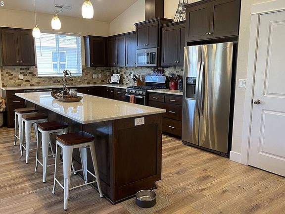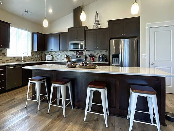- Features: Island, Pantry, Free Standing Range, Free Standing Refrigerator, Quartz, Vaulted Ceiling