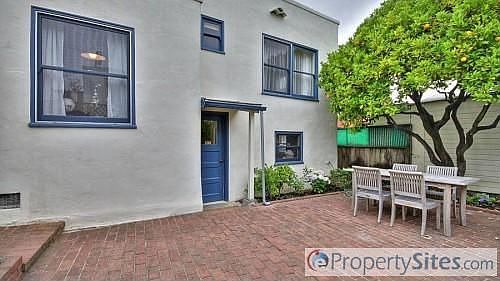 Sunny Mediterranean. Entry hall, living room with raised ceiling, fireplace, plantation shutters. Formal dining room, 3 bedrooms, bath with ribbon tile floor, sunny kitchen. Bonus room for office or family room. Laundry with good storage, detached garage. Possible to have 2 home offices!