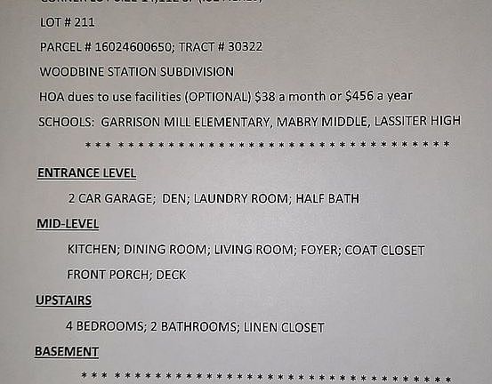 1% BUYERS AGENT FEE offered CALL (706) 749-1158 PLEASE LEAVE VOICEMAIL; this is a landline not a cell EMAIL dont_know@comcast.net 4 BR / 2.5 BATH IN WOODBINE SUBDIVISION 1,748 SF above grade; 305 SF below grade; 692 SF unfinished basement ORIGINAL OWNER HOA dues of $38 monthly to use facilities is OPTIONAL