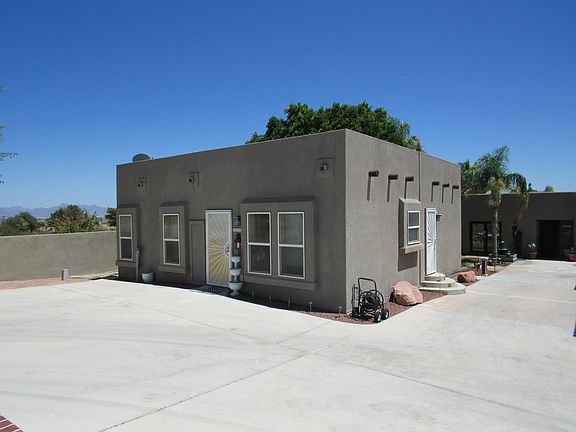 One of Blythe's most beautiful custom homes with full solar system. The exterior is amazing with a Resort look. If you are looking for luxury, this well maintained home has a ton of amenities; open floor plan with a grand entrance. Large open kitchen with lots of cabinet space and center Island is a chef's delight. The view from the living room overlooks the golf course and Palo Verde Valley. Two master bedrooms, primary master bath has a walk in shower, a smart toilet-bidet and urinal. All bedrooms are of good size. Attached three bay garage. An additional 900 sq ft 2 bedroom/1 bath Mother-in-law quarters on the property with comfortable living room and a good size kitchen. Included on the property is a 40x60 metal insulated garage with plenty of room for all your toys and extra storage. If that isn't enough, there are 6 RV rental spots. All are rented out at this time, Must see to appreciate all this home has to offer. Security alarm and surveillance system included.