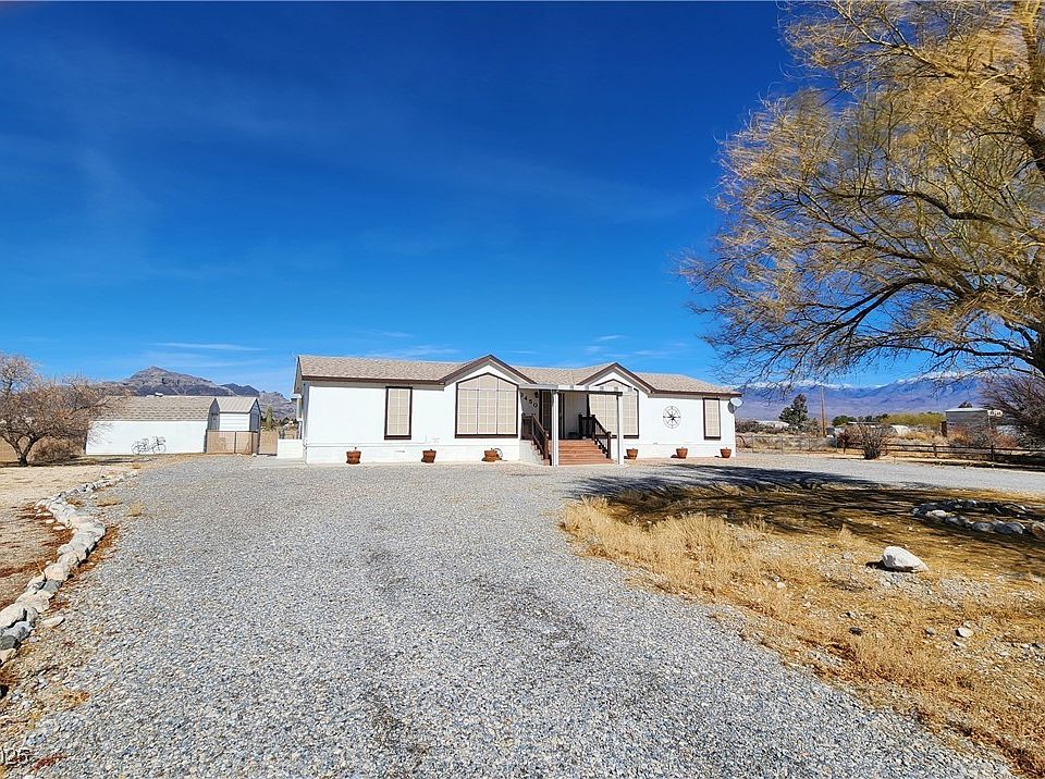 Discover this adorable 3 bed, 2 bath manufactured home on nearly an acre in beautiful Pahrump! Enjoy breathtaking mountain views, a spacious 2-car garage, and a fully fenced backyard for added privacy. The split floor plan features a large dining room-kitchen combo, perfect for gatherings. The oversized primary suite boasts his & hers walk-in closets, a relaxing soaking tub, a separate shower, and double sinks. Both guest bedrooms also include walk-in closets for extra storage. Step outside to a great covered back patio—ideal for enjoying Nevada’s gorgeous sunsets. Private well & septic, no HOA! Don’t miss this one—schedule your showing today!