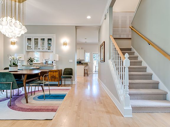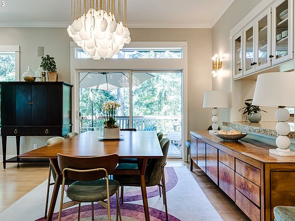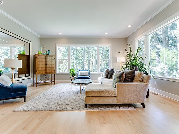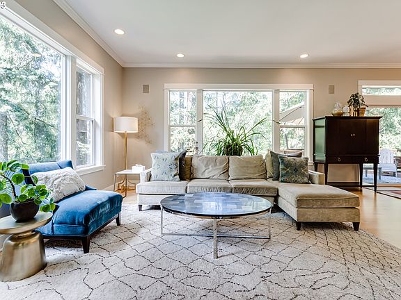 Exceptional South Eugene home! Throughout this beautiful home, tall ceilings and large windows allow natural light to enter the home with tranquil views of the forest. Excellent floorplan with 4 bedrooms plus an office. The main level features a spacious dining room/living room with a stunning chandelier, beautiful hardwood floors, lovely kitchen with breakfast nook, half bath and office with fireplace. The upper level boasts a dream primary suite with a sitting area, walk in closet, full bathroom with granite counters, dual sinks, walk in shower and separate bathtub.The lower level has a second living room/bonus room, along with 3 additional bedrooms and 2 full bathrooms. Option for 2nd primary bedroom, creating flexibility for many possibilities. The laundry room has ample counter space and storage.Natural wool carpets are in all carpeted areas of the home, lovely crown molding, and a 3 car garage. Located close in to town, while in the forest with a short distance to restaurants, I5, U of O, South Eugene Schools, and also the ridgeline trail system. On over 1/3 of an acre, the outdoor space is in the forest, with decks for entertaining, and a lovely, private backyard.